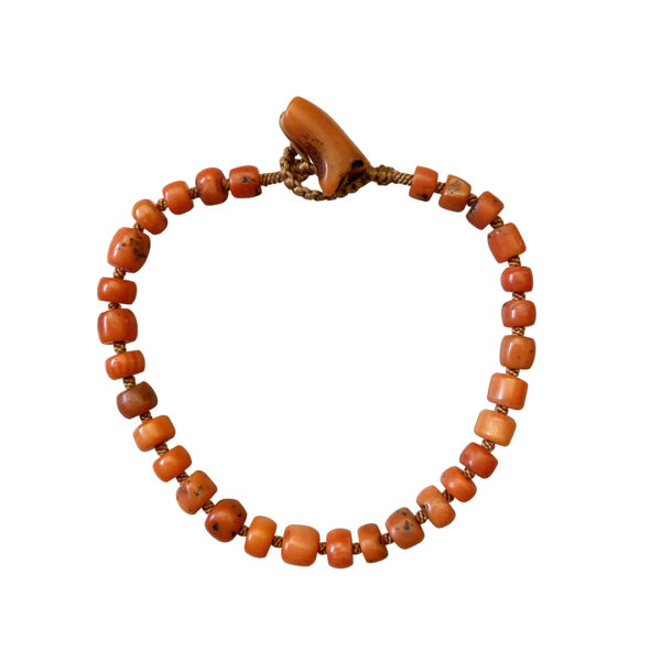 A very lovely coral bead bracelet with our finest hand woven cord between each delicate bead. One of a kind