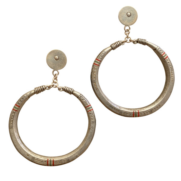 These fabulous aluminum and enamel hoops have been in Jewels collection for over 25 years. We wrapped sterling and clip tops so they hang easily and comfortably.