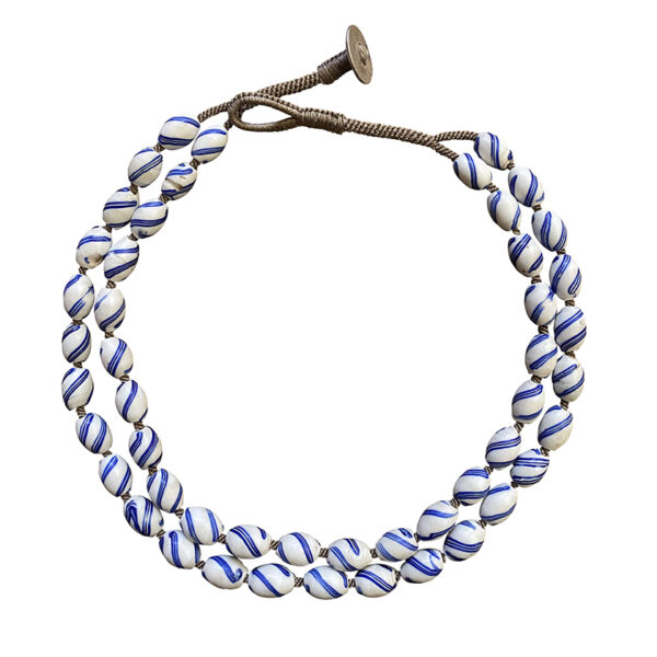 Early 20th African trade beads of bright white and blue. These days old trade beads of this type and quality are more scarce. We wove the cord between each bead for elegance and to keep them from chipping.