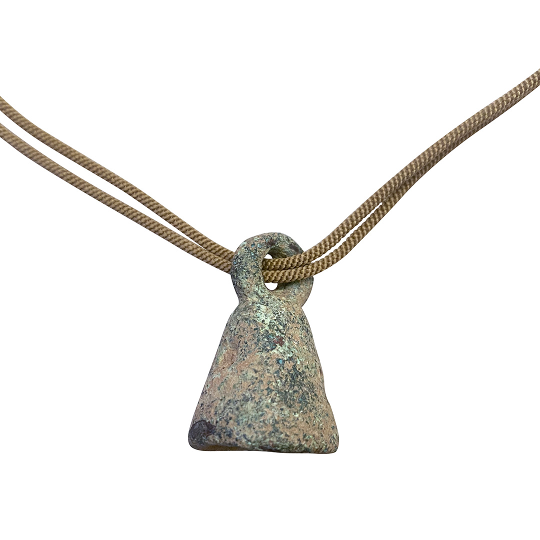 You have to feel this wonderful object of the very ancient past. There’s something magical about it, not to mention the perfection of patina and color. We wove two, not one, of our finest cords and joined them at the old Moroccan copper coin closer. Pure cool.