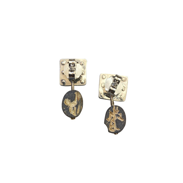 The gorgeous scarab beads are ancient Egyptian faience . They are unusual because the color was made to look like lapis, not an unusual color nor unusual stone in ancient Egypt. Notice the seals on the obverse. There is always something wonderful about the hidden details. The beautiful silver square coin tops are Medieval Moroccan, approximately 1130 -1250 CE. We riveted them to sterling and added the surgical steel posts. Please advise should prefer clip tops.