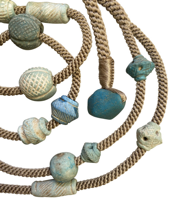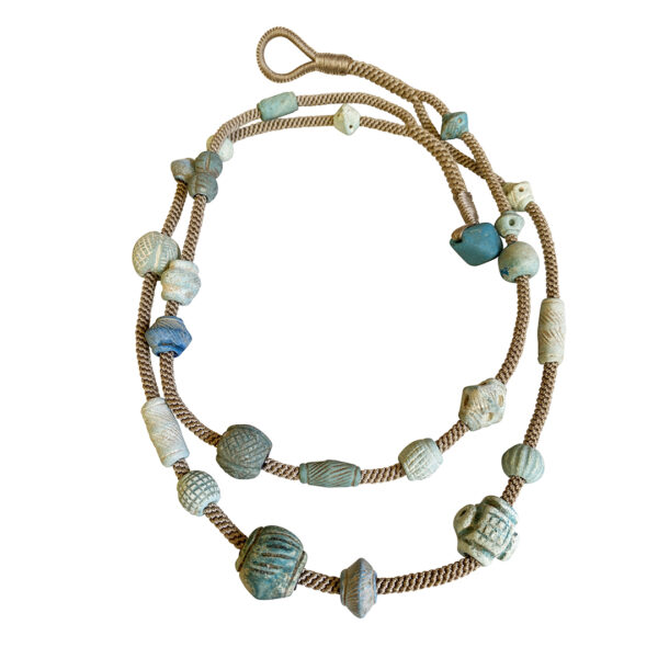 These spectacular handmade (of course!) ceramic beads have the remains of the faience slip, hence, the gorgeous blue. Imagine the person who formed, cut and incised each. Who wore them so long ago!? Jewels geniously designed the necklace in two strands, carefully placing each with specific instructions to the most talented Khadija on how and where to weave the cord. The gorgeous aqua blue closure is ancient glass.
