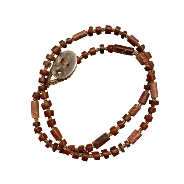 Ancient brick red colored spondylus (Spiney oyster) beads meticulously chosend and placed between the finest hand woven cord. Spondylus is found in the ancient jewelry of Mexico, parts of South America and among the Anasazi. The people of the Santo Domingo Pueblo have also continued using the shell in their fine jewelry. This pbracelet wraps twice.