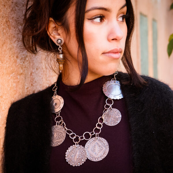 The gorgeous sculptural wood drops are the stopper tops of wood kohl (eye makeup) jars.  Over time they got separated and Jewels finds them in the stashes of old dealers in the markets.  Sometimes, the keen ones, know the kinds of things Jewels likes and they will come to her with their finds.  These two have such wonderful patina and are so smooth to the touch.  We capped them with sterling and also made the sterling embellished tops.