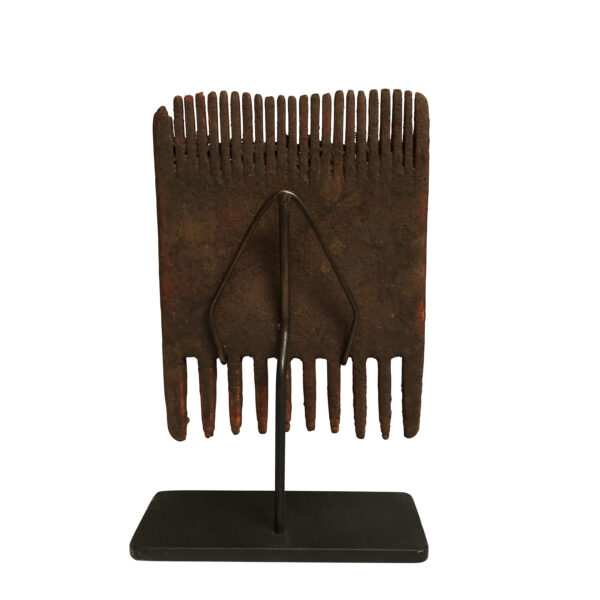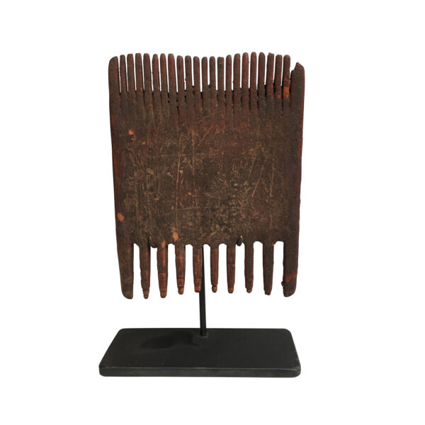 A wooden comb with excellent patina and great sculptural qualities. Custom made stand.