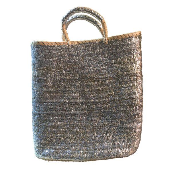Jewels bought this basic Berber carrying tote in the souk and added the bling, silver sequins and leather handles. Remember, this is all hand woven and stitched.