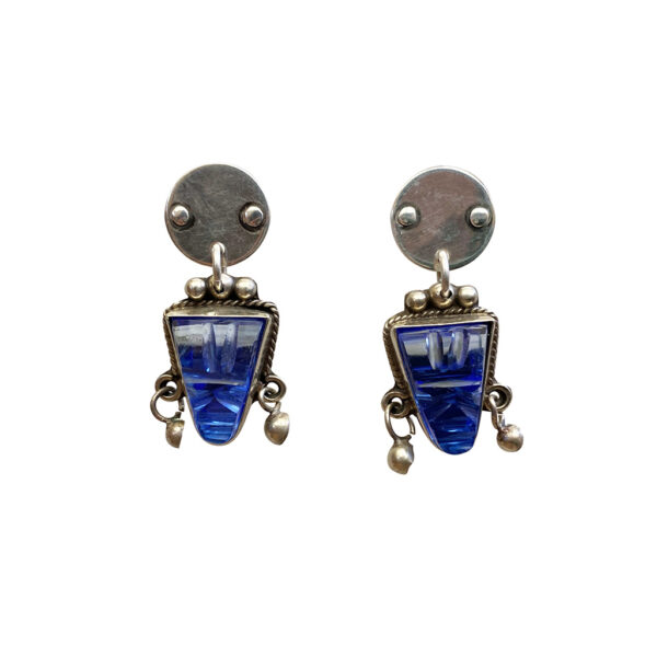 Very talented Mexican silversmiths and stone cutters were inspired by the incredible archaeological finds of Central America. The reproductions and designs inspired by the ancient sculptures of the Mezcala, Chontal and Olmec became a tradition in its own right. These earrings are a fine example of this tradition with fine cut glass and sterling. We put them on Jewels standard sterling post discs.