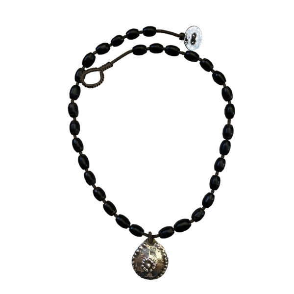 These classic and rare 19th century black Bohemian beads (made in Bohemia) are extremely rare and fabulous with the Moroccan silver charm, very chic.