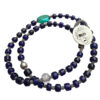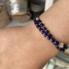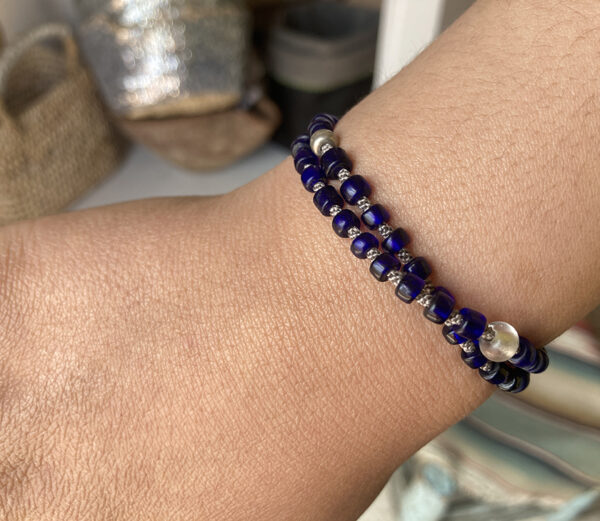 This double wrap bracelet is composed of gorgeous dark blue glass Cambodian beads with a few surprises to add more chic. The hand weaving between each bead is the lovely work of Fedua in our Marrkach atelier. This piece is for a smaller wrist.
