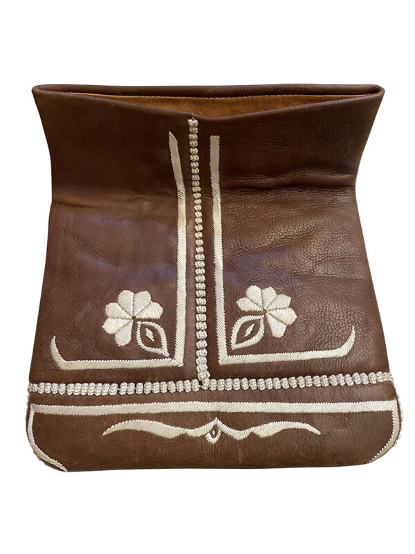 These purses, with the beautiful rope strap and embroidery, are very traditional artisan leather work in Marrakech. It is becoming a dying tradition as there are now only a couple of people making them where once Jewels knew many.