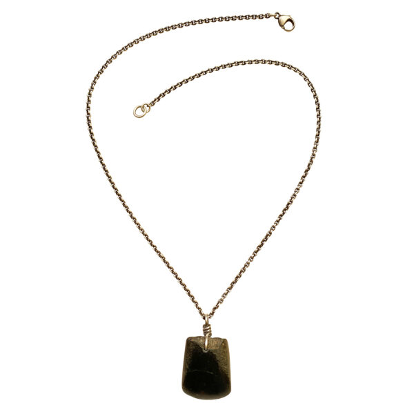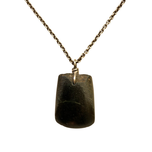The “celt” is a misnomer, probably derived from the pieces similar in form found in the British Isles. These stone objects are found all over the world based on stone age hand tools but with no expected wear. They were most likely ceremonial as some, such as those from the Olmec regions of ancient Mexico(c. 1200 BCE), were found arranged in Stone Henge- like formations. This piece is smaller than most and it may have actually been a tool. It’s perfect for a man or woman.