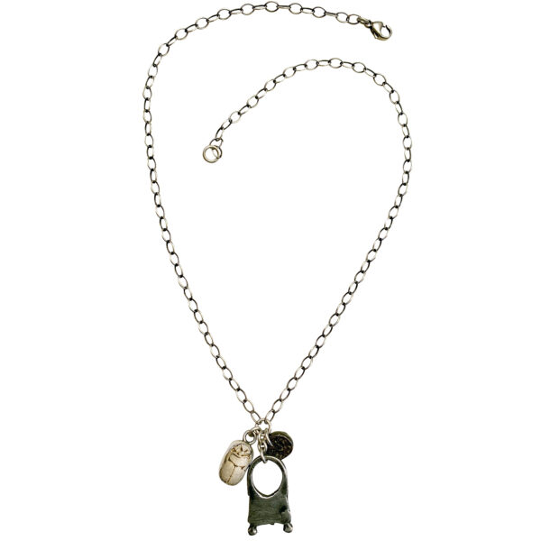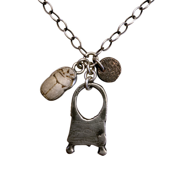 The stone scarab is Egyptian (date unknown), the copper coin is 10th -12th century Indian and the silver charm is a fabulous silver 19th – early 20th century Tuareg ornament so worn from wear and devotion. It is a talisman to ward off the evil eye- so helpful these days!