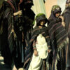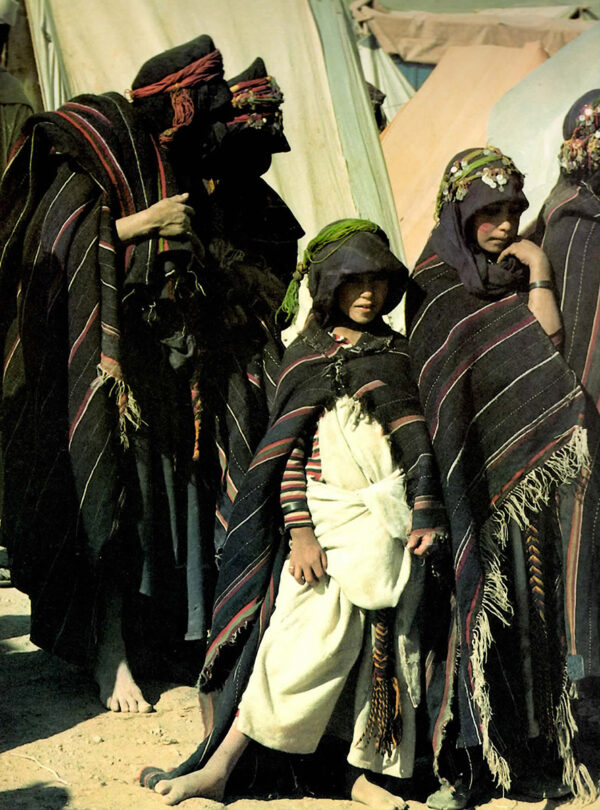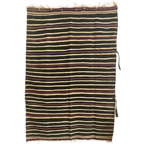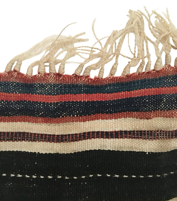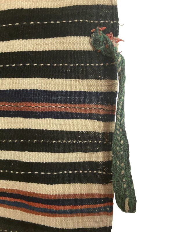 A superbly woven wool blanket utilizing a variety of techniques in a perfect small size. The colors are blue, indigo, red, white, black and natural. The green straps were used to tie the textile around the neck. There is the expected wear around the edges and fringe but is otherwise in excellent condition