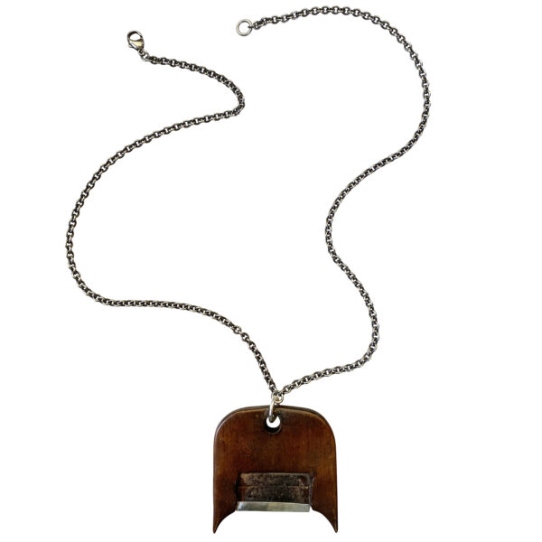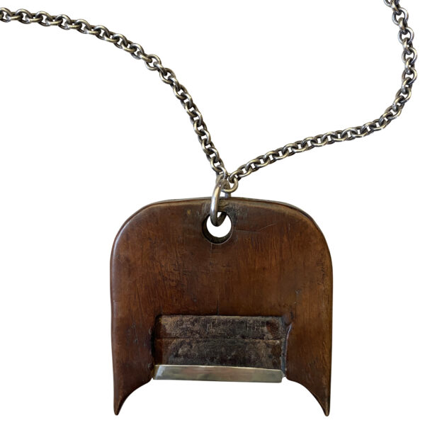 This piece was used to cut the rice grasses, the staple food of so many Asian peoples. It is made of wood, so smooth from use. The patina is just perfection. The blade remains, but we capped it with sterling for your protection. The chain too is sterling