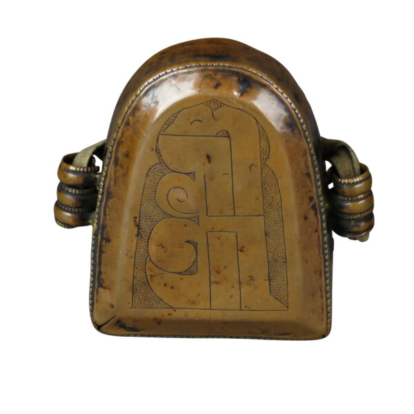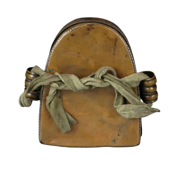 A copper prayer box with the OM symbol (In The Name of God). The box has a well used leather strap.