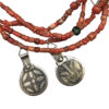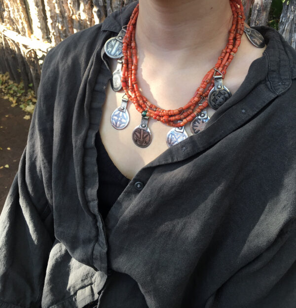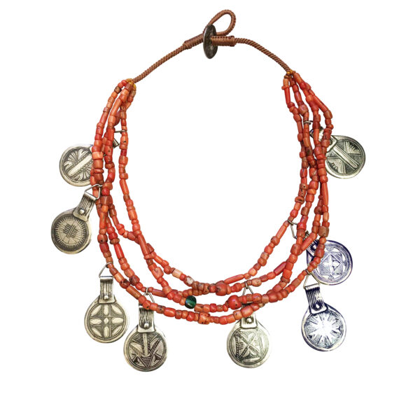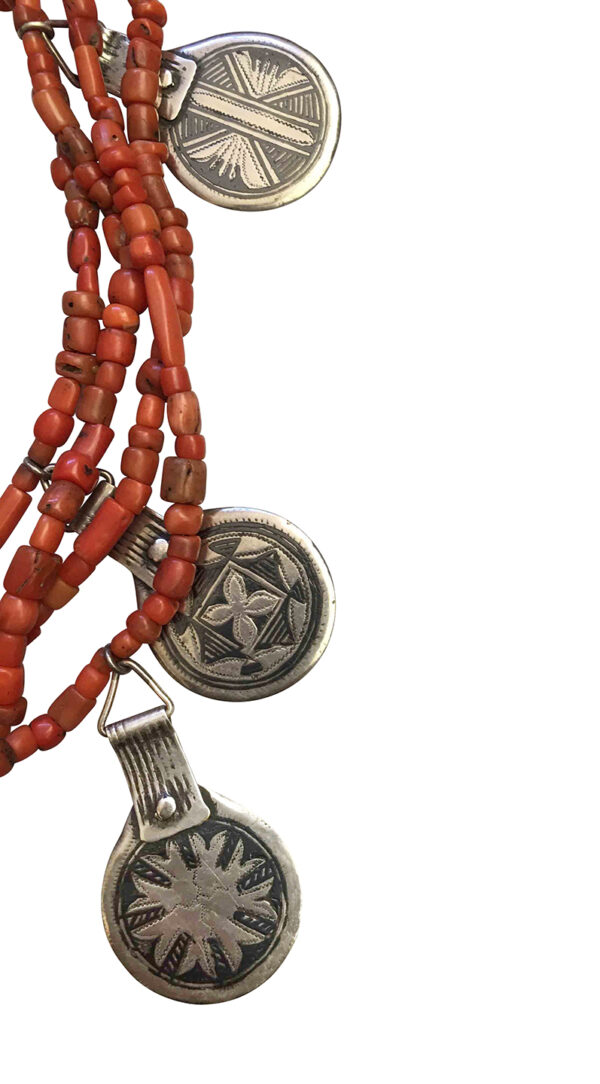 The silver charms are niello etched, a process very traditional among the Berber people of the Ida Ou Nadif region. These silver charms are wonderfully abstract and quite unusual for this type of charm. The coral beads are beautifully sized and perfectly strung. The jewelry, silver and coral, define a woman’s wealth and is an important part of her wedding gift from her fiance.