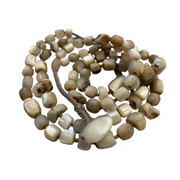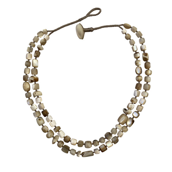 While in Morocco these past six months Jewels was able to acquire this small group of absolutely fabulous mother of pearl trade beads from a trader who had been holding on to them. She hasn’t found beads like these in years! It’s a beautiful piece with no end of fascination and intrugue. Notice the details, the mix of organic and sculpted beads is truly a one-of-a-kind. A pearl necklace like no other.