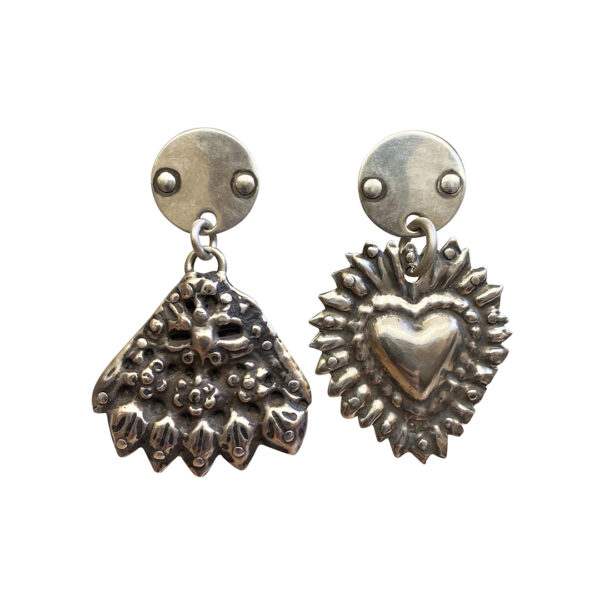 A silver Chinese charm met a silver Peruvian amulet and fell in love. We backed both in sterling sheet and the top post tops are hand worked sterling as well.