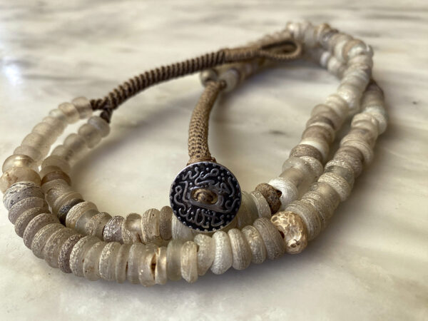These glass beads have a very organic feel, none exactly alike and crusty with age. They are very cool with simple black or white.