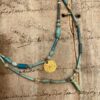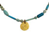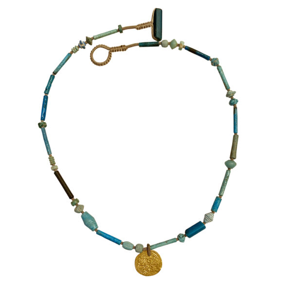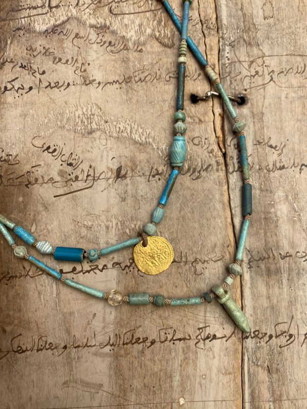 Stunning Egyptian blue faience beads and a gorgeous gold Islamic coin, c. 17th century, delicately spaced with our very finest hand woven cord.
