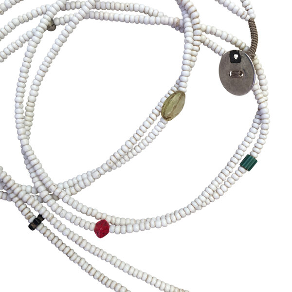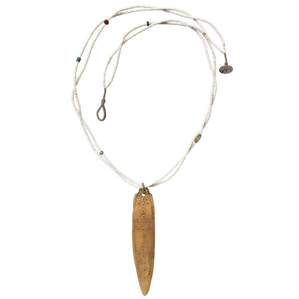 Extremely rare bone shaman’s charm from Ethiopia on a double strand of white glass trade beads. There are a few eccentric glass beads too.