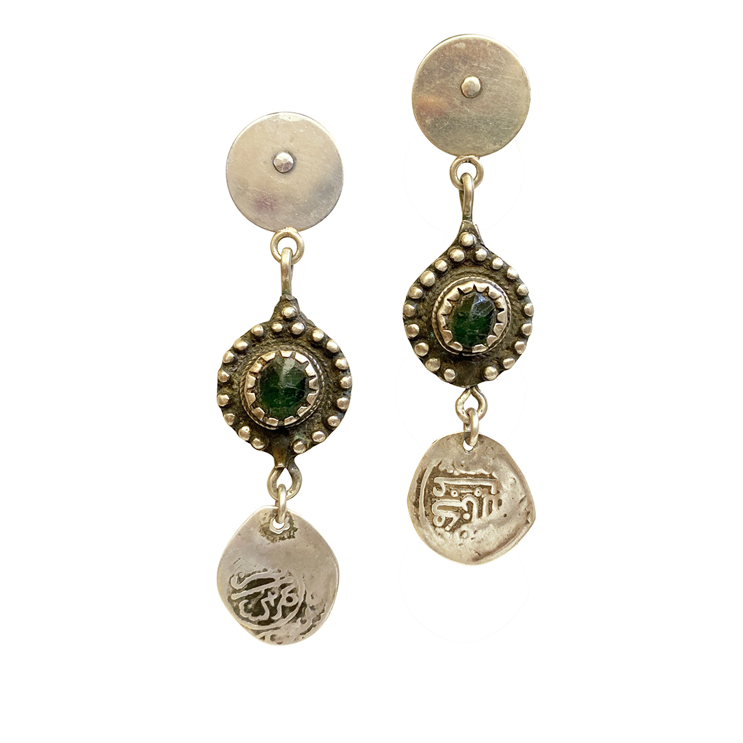Jewels has had these in her private collection for over 25 years. The green glass, protection against the evil eye, is set in older heavier Islamic coins refashioned, some 100 years ago, beautifully into charms. The Moroccan silver coins at the bottom are 17th – 19th century of a type we collect as much as possible. These however are larger than those we mostly find and have more silver. Jewels likes the look of the clip tops but should you prefer posts or hooks, please advise in the memo at check out.