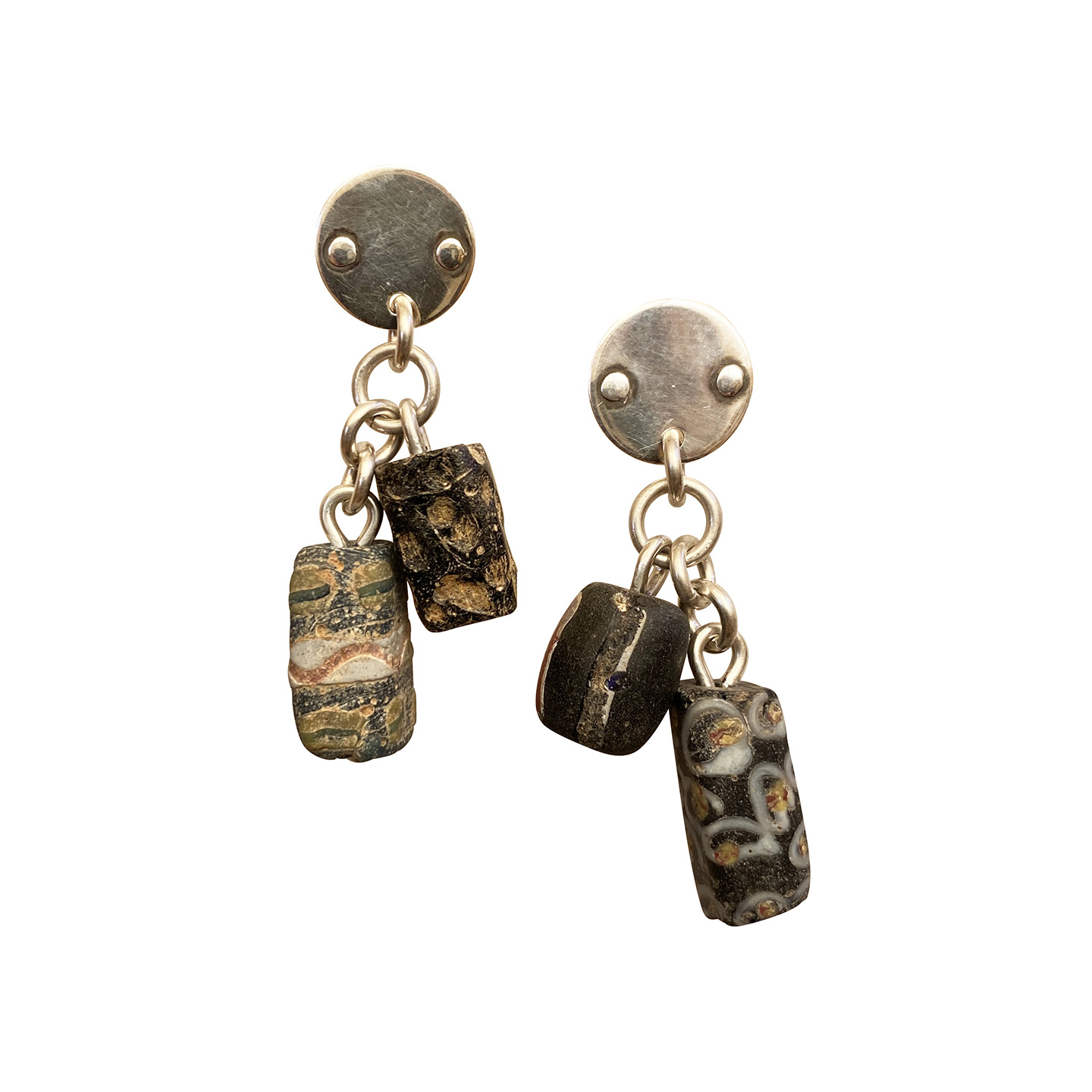 18th & 19th century (or before) very unusual European made glass beads with gorgeous patina.  We made the sterling post tops and links.