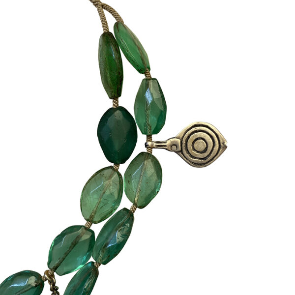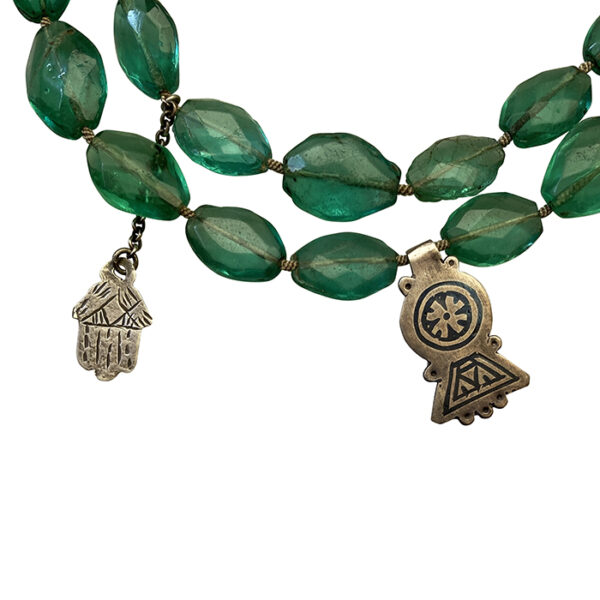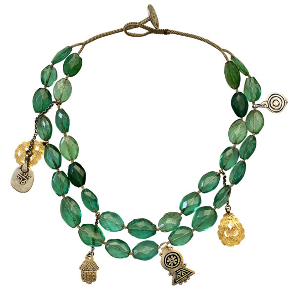 Silver & gold charms and amulets and sterling chain are meticulously woven in between faceted French glass trade beads, coveted and collected by Amazigh women…. and Jewels. These specific beads were made for the Moroccan trade.