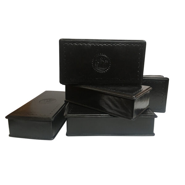 Jewels commissioned these hand tooled leather boxes in Marrakech, where artisanship and leather work have long been tradition. The camel and rider is also a common image on these lovely boxes.