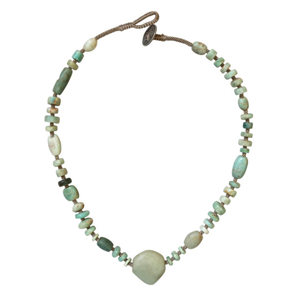 Jewels calls this a hippie necklace (as she is known to have that carefree and unpredictable way). One could call it a petit Frida piece as Frida Khalo might have worn something like this but, say, gigantic. Jewels arranged the beads in such a perfect way with just the right amount of eccentricity and sophistication that your bohemian daughter will be the coolest in her t-shirt or you will be a stunner with your simple black dress. There are a couple ancient Pre Columbian beads thrown in for good mojo.