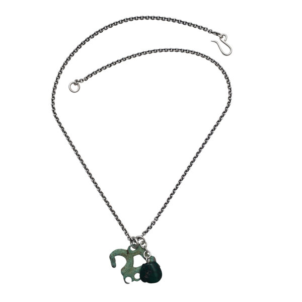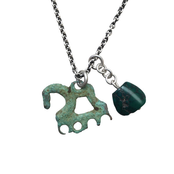 An ancient Roman or Central Asian bronze charm, possibly a horse, and a beautiful Tibetan turquoise bead.