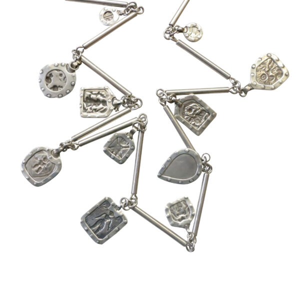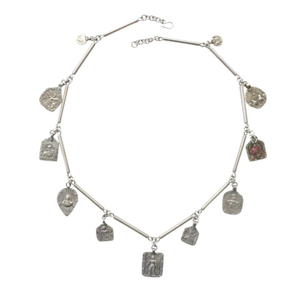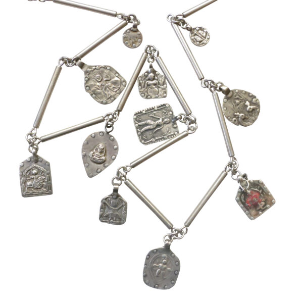 Each amulet is unique and fabulous in its own way.  There are those from more rural regions with lovely and unusual folk imagery. There are remains of offerings, such as the red pigment and silver links and imagery that.  We backed each with riveted sterling in Jewels’ signature way.  Notice even the details on our framing- true artistry!  The sterling chain too is hand made  in our Santa Fe studio.