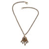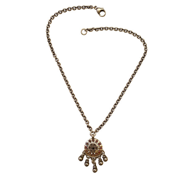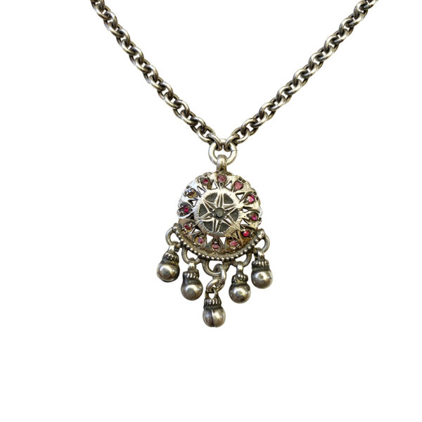 A sweet silver charm with dangling baubles and pink glass set circling a central florette or star that has a central darker glass stone.