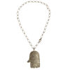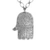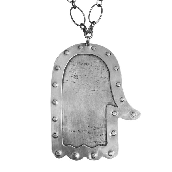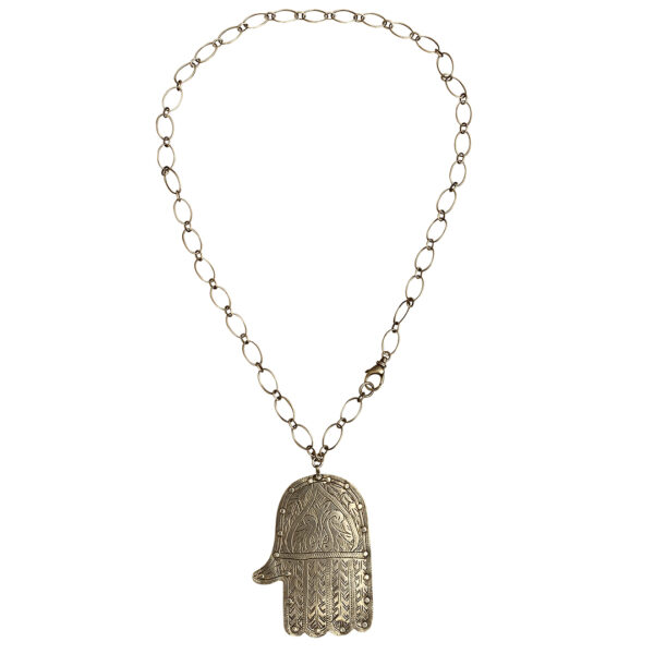 A gorgeous native handmade silver hamsa worn on the body as protection.  We restored it with a riveted sterling sterling frame on the back side.  The hasp to which we connected the sterling chain is original.