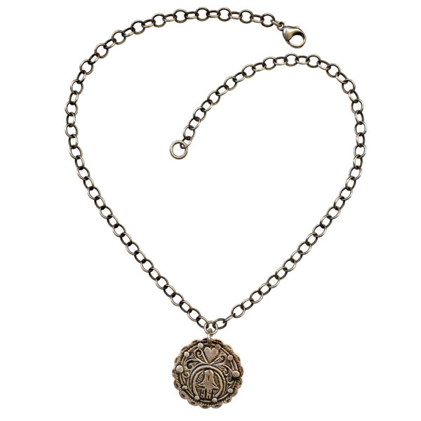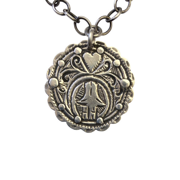 The medallion is a classic silver hand etched scalloped edge shape. These were made as headdress charms. Etched in the design are a hamsa, for protection against the evil eye and and a heart. We restored it with riveted sterling.