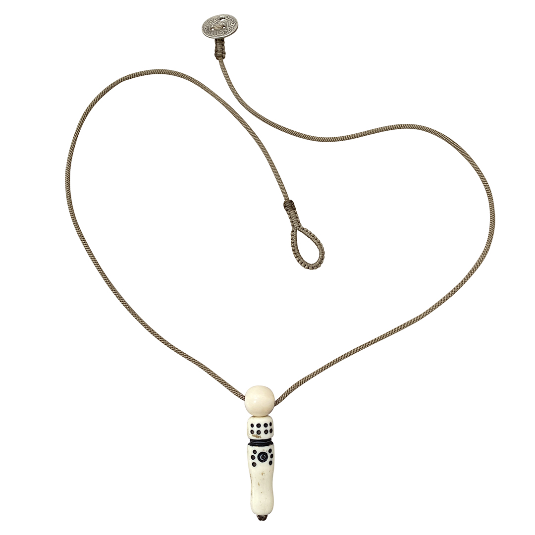 The bone comes from Tibet but the prayer bead was made in and for people of the Middle East, a small example of how we are all connected. Jewels has had this bead for 30 years and decided only now to put it back out into this mysterious world. The hand woven cord is the fine work of Fedua in our Marrakech atelier.