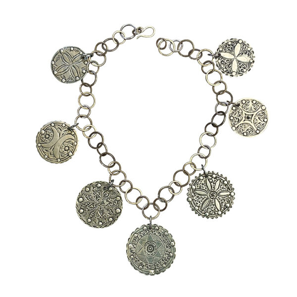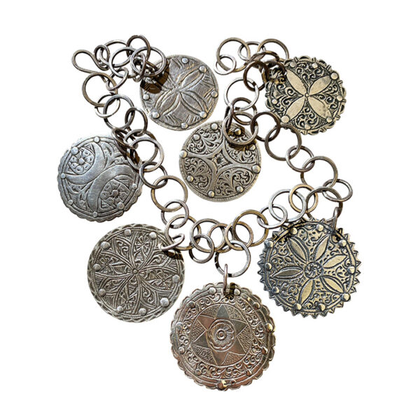Gorgeous traditional hand etched silver medallions worn in her headdress. We restored each with sterling sheet riveted to the back sides and made the hand wrought sterling chain in our Santa Fe studio. This is gorgeous and fine contemporary work is in keeping with the old and traditional work of the Amazigh people. If you’re not seated in wonder at each piece, front and back, someone else is sure to be eyeing your neck!