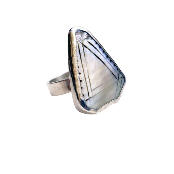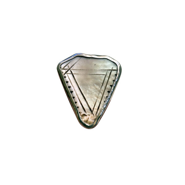 A word about the photography. It’s terrible! The good news is this piece, all of our work in fact, is so much better than the images convey. The silver is clean and bright. It shines. If you are familiar with mother of pearl then you understand the essence of this. It is opalescent, warm and cool with whites, pinks, yellows, blues and greens at different angles, subtle and magical. Because the charm is old, worn and organic it has the expected and much desired wear.