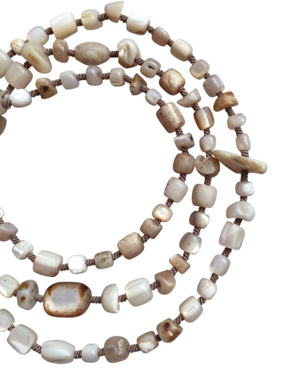 After more than a year Jewels found more of these gorgeous mother of pearl prayer beads; enough to make two more necklaces. She was able The beauty is not only in the lovely delicate beads, but also in our fine work. Notice the hand woven cord between each tiny bead. These necklaces take 3 days to make.