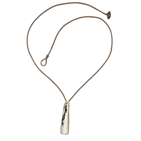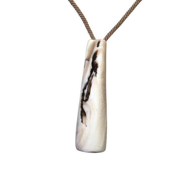 Jewels bought a large collection of these shells but that means not all are workable for her designs and only one, this one, was perfect for this design, hanging vertically from our hand woven cord and ever so chic.