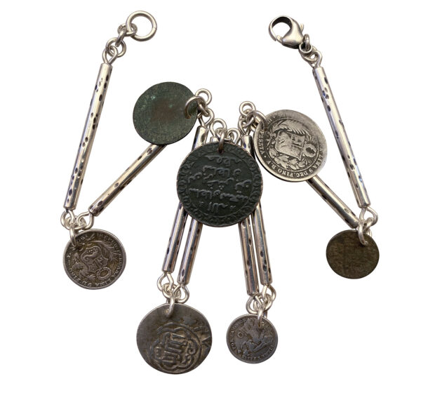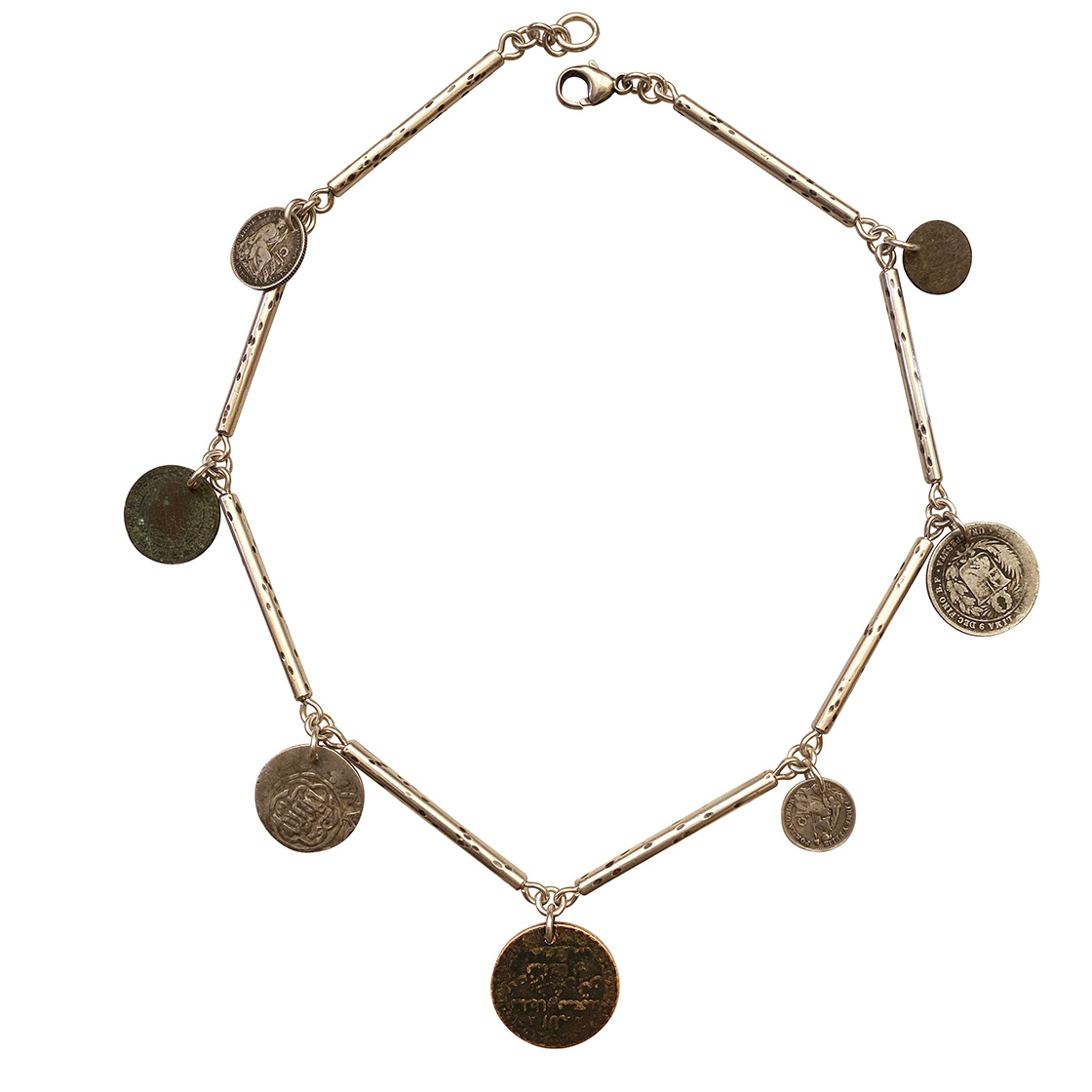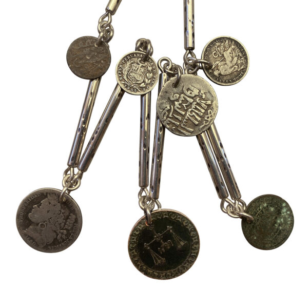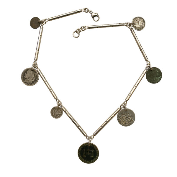 A beautiful combination of coins, perfectly eccentric and our hand pieced sterling chain.