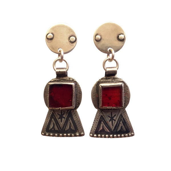 This Berber group of Imazighen peoples are known for their beautiful work in silver and incorporating glass. Jewels bought a small group of the charms from a private collection. They are the finest works, the likes of which she has not seen for years. This pair of fab silver charms set with red glass, to ward off the evil eye, are on silver post tops.