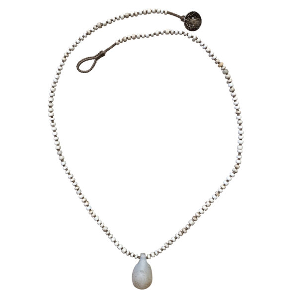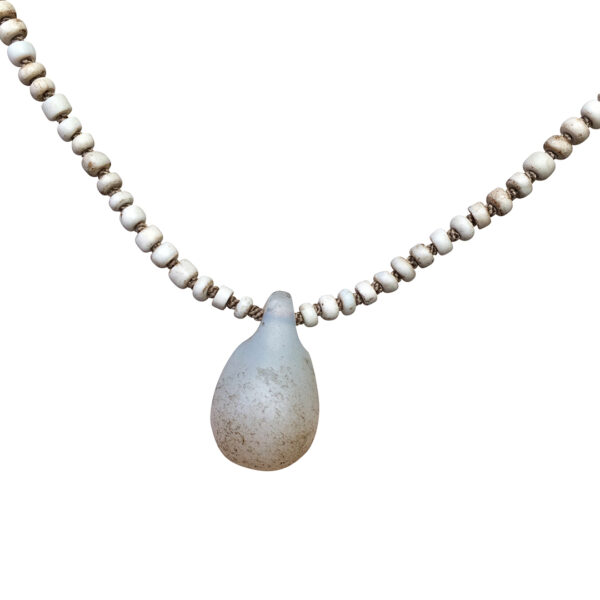 This is breathtaking in simplicity. These white glass beads, the central piece from Mali and the others African trade, have the beautiful patina of adoration, wear and time. So while all white there are the subtle changes that give this piece such beauty and depth. We wove the cord between each bead, a tour de force in design and work that took three days to complete. The luminescence shows best when worn, as on the model.