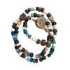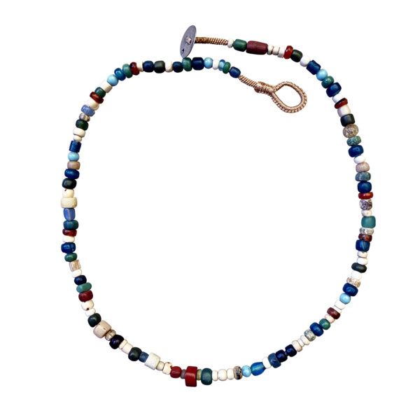 19th and early 20th century European glass trade beads. Jewels calls this an “ode to the Native American” because the colors remined her of those used in Native beaded jewelry. It’s a wonderful mix of beads, some traded in the Americas and others found in many parts of the world. We finished it with Jewels’ traditional hand woven cord and a Moroccan coin closure. Wrap it three times to wear as a bracelet. This would be great on a man as well.