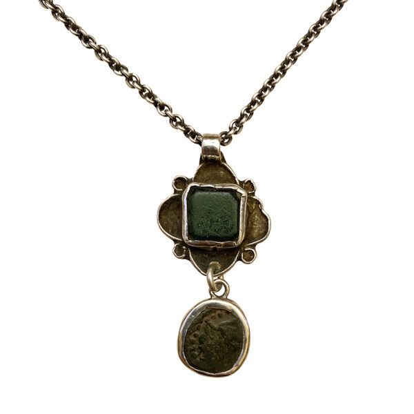 The charm is Amazigh (Berber) from Morocco.  It is such a wonderful little charm that has incredible patina and wear.  The central set piece is either very opaque green glass, as is traditional, or a green stone.  True to the Amazigh spirit and tradition, we added value and beauty to the charm with a silver bezeled old (c. 10th century) Afghan or Indian bronze coin.  The chain is sterling. It is difficult to overstate the charm of this necklace.