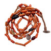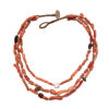 African glass trade beads, made in Europe, strung [no so] randomly with gorgeous north african coral beads.  The coral is a subtle mix of salmon orange/pink and red and the cord is meticulously hand woven, as always, between each bead in our Marrakech studio.  While not always writen in the descriptions, the button closures in many of our pieces, as is the case for this necklace, is an antique Moroccan coin.