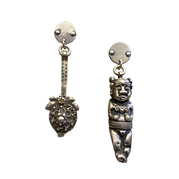 The figure is a protective charm, hollow silver, for a child and the the flower with glass center was an old charm, a lovely pair.