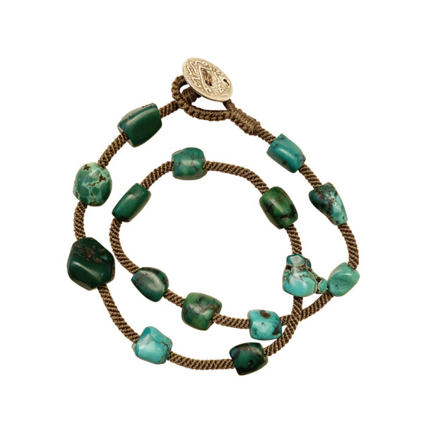 Once upon a time Jewels was able to have a couple of kilos at a time of very old Tibetan turquoise.  Gone are the days.  She managed to find this small group of absolutely stunning turquoise, just enough for this fabulous bracelet.  These colors france from sky blue, more rare, to deep water green.  If someone is staring at your wrist, don’t take offense.  They cannot be blamed.