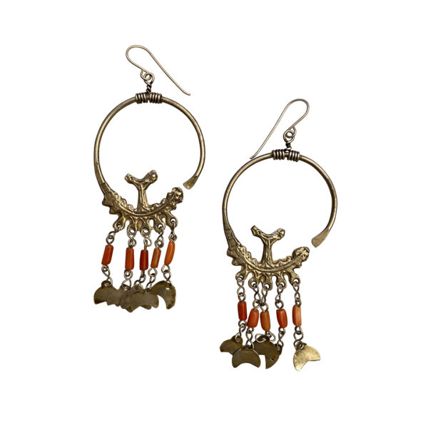 Original gold washed silver earrings with coral beads and half moon dangles