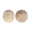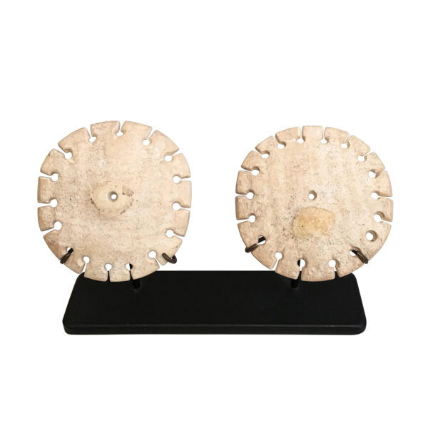 A spectacular pair of shell ornaments probably once sewn on a textile figure. There is the expected wear of time and a small chip on the underside of one, but look closely- perfection.